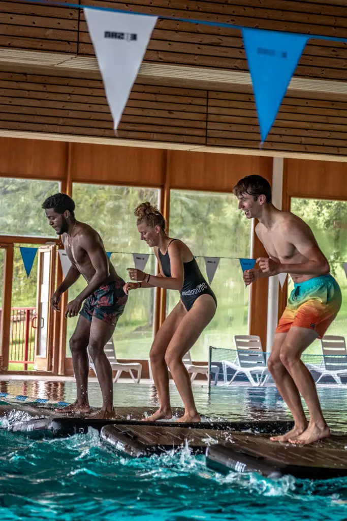 Venez tester une séance ludique sur un matelas flottant, où votre gainage est mis à l’épreuve dans la bonne humeur !