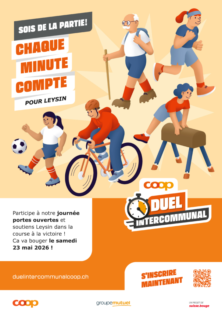 Cette année, Leysin entre dans le Duel intercommunal Coop ! Durant tout le mois de mai, chaque minute de mouvement compte pour faire grimper notre commune dans le classement national. Toute activité sportives : du 1er au 31 mai 2026, toutes les minutes bougées peuvent être comptabilisées pour Leysin. Le but ? Bouger ensemble, sans pression ni compétition individuelle, simplement pour le plaisir de participer et de représenter sa commune !
